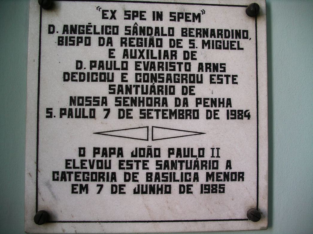 Em um dos mais belos bairros da cidade de São Paulo está situado o novo e importante Santuário que pelo esplendor singular de suas obras de arte e pela sua amplitude e majestade tornou-se muito conhecido e foi consagrado, no ano passado, a Nossa Senhora da Penha, já anteriormente escolhida para Padroeira de São Paulo e como tal sempre honrada piedosamente e fielmente venerada pelos habitantes da cidade.